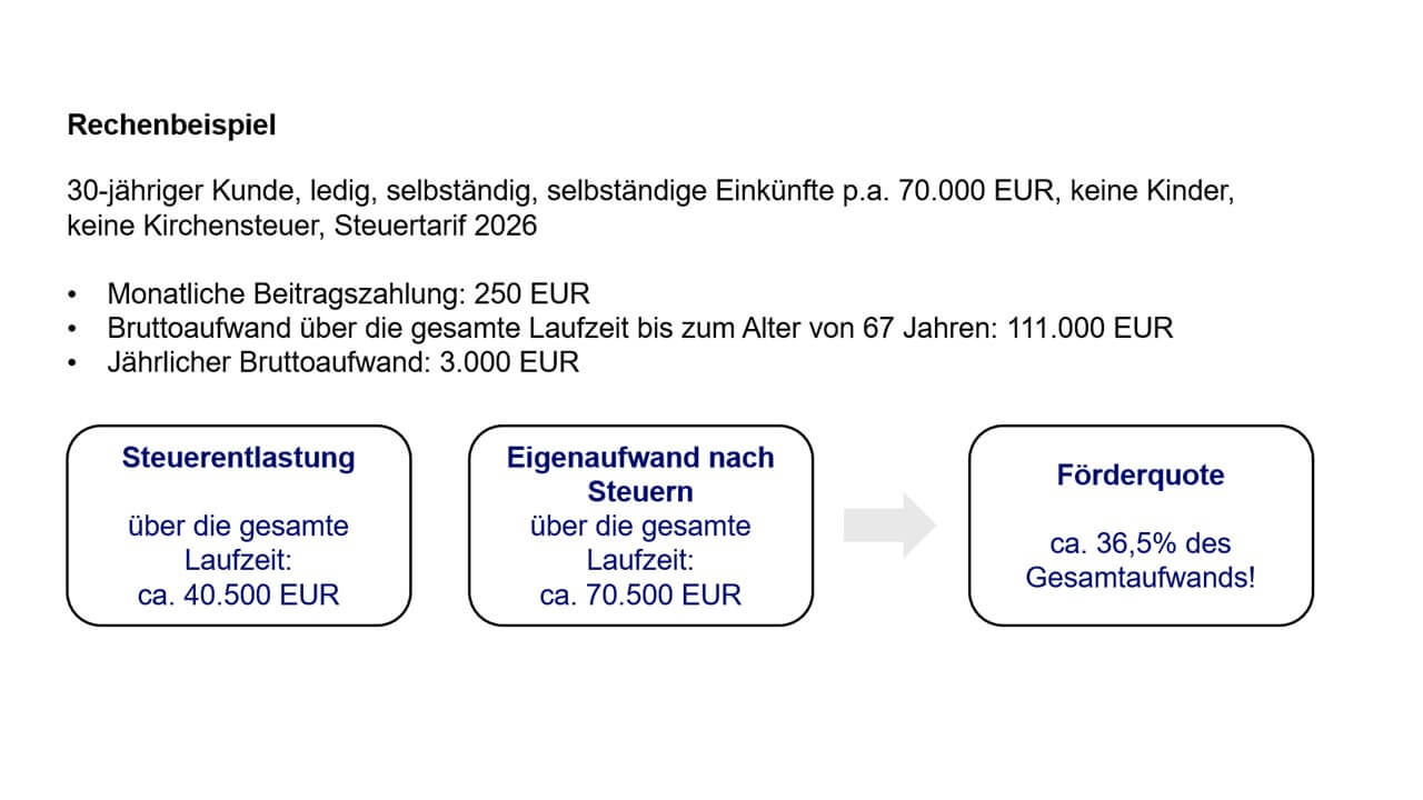 Die Beiträge zur Basisrente sind vollständig als Sonderausgaben absetzbar – also zu 100 %. Dadurch profitieren Sparer:innen von einer attraktiven staatlichen Förderung: Denn ein Teil der Einzahlung fließt über die Steuererstattung vom Finanzamt zurück und steht zur freien Verfügung.